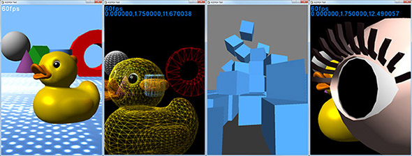 OpenGL/DirectXによる描画、GLSLシェーダーの活用、物理エンジン(Bullet)、イベントシステムなどを搭載し、