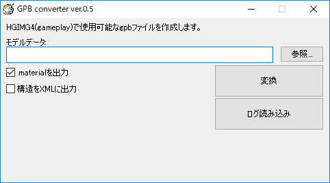 出力されたFBXファイルをHSP3(HGIMG4)から使用するためには、モデルデータを.gpbファイルに変換する必要があります。 .gpbファイルへの変換は、同梱されているGPB converter(gpbconv.exe)を使用します。ツールから、FBXファイルを選択して「変換」ボタンを押すことで、FBXファイルと同名の.gpbファイルと、.materialファイルが生成されます。