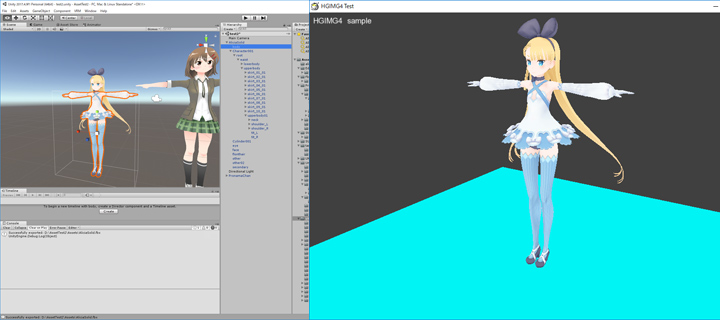 ※現在のバージョンでは、HGIMG4のモデル変換時の制約により、モデルのスキンメッシュ(Skinned Mesh Renderer)のある階層に回転やスケーリングがある場合、正しくHGIMG4上で表示されないことがあります。プロ生ちゃんモデルなど、一部のモデルデータを出力する際に、メッシュ階層の回転は0にやスケールは1にしておくようにしてください。それ以外の階層における回転やスケーリングは特に制限はありません。