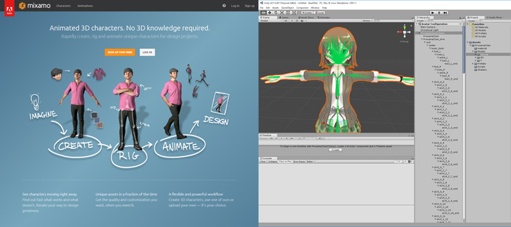 アニメーションをモデルに適用する方法はいくつかありますが、手軽にアニメションデータを入手できるサイトとして、mixamoがあります。 mixamoは、様々なモデルに対してアニメーションを適用したものを無料でFBXファイルとしてダウンロードでき、自由度の高いライセンスとなっています。