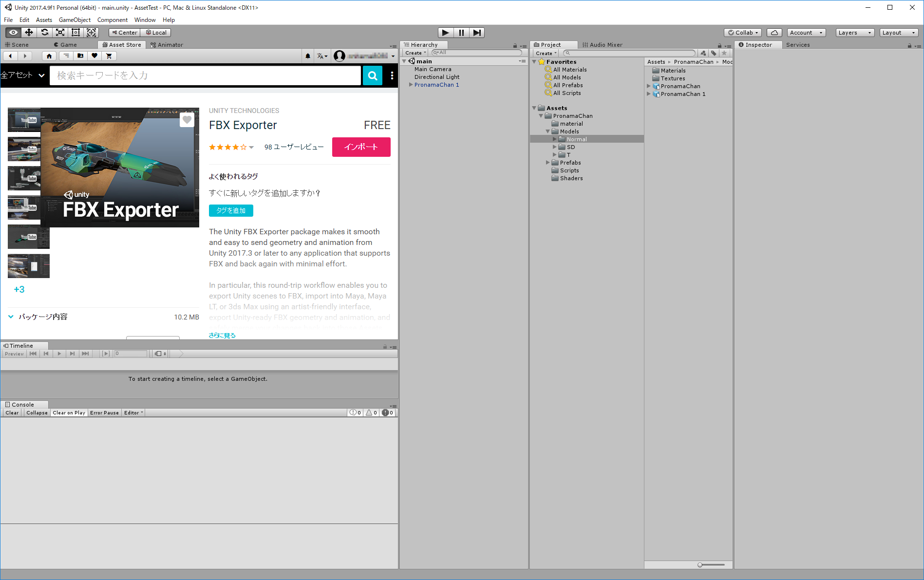 Asset Storeから、FBX Exporterをダウンロードして現在のプロジェクトにインポートします。FBX Exporterは、Unityが公式に配布している無料のアセットになります。