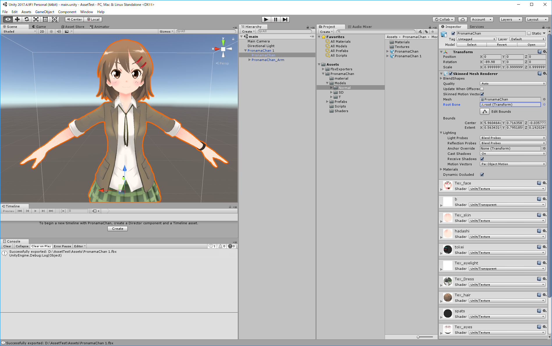 PronamaChan.fbxファイルのインスペクタで、モデルを取り込む際のマテリアル設定を行うことが可能です。