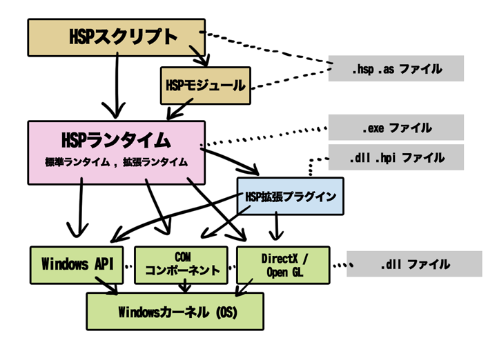 HSP本体は指定された オブジェクトファイルを読み込み実行するための核となる部分です。 これはHSP3.EXEですべて行われますので、それ以外に余計なDLLやモジュールは必要としません。