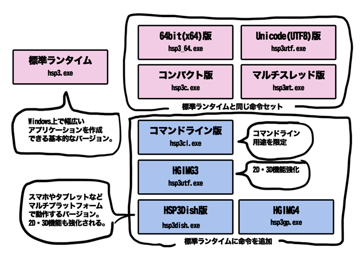 HSPランタイムは、HSPの機能を拡張したり変更するという意味で「HSP拡張プラグイン」に近いものですが、 「HSPランタイム」は、さらに深くHSP全体の機能を置き換えるものとして考えてください。 HSPフルセットには以下のHSPランタイムが同梱されています。 使用する際の参考にしてください。それぞれのランタイムごとの詳細は、別途マニュアルが用意されていますので、そちらを参照してください。