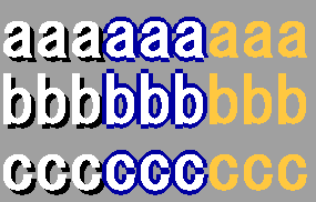 上の例では、左が影付き文字、中央が縁取り文字、右が通常の文字になります。